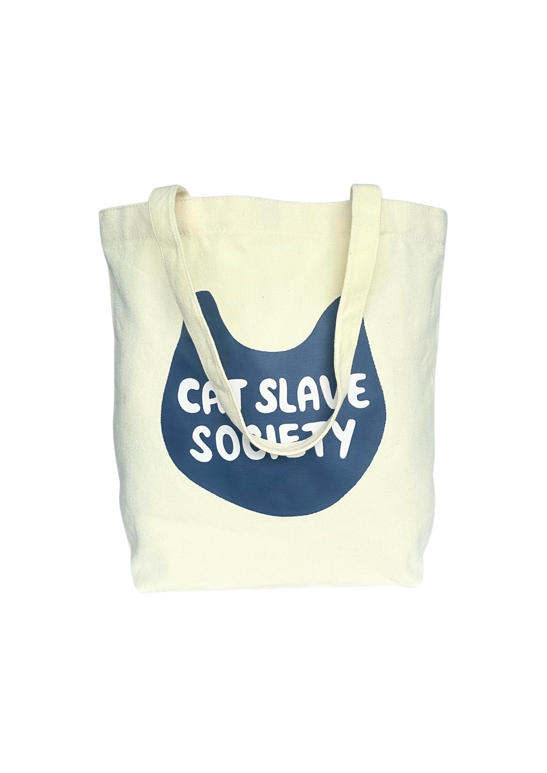 Large cotton canvas tote with Cat Slave Society logo print. The Cat Slave Society Tote Bag features a gusset for optimal storage, an interior pocket, and a magnetic closure.